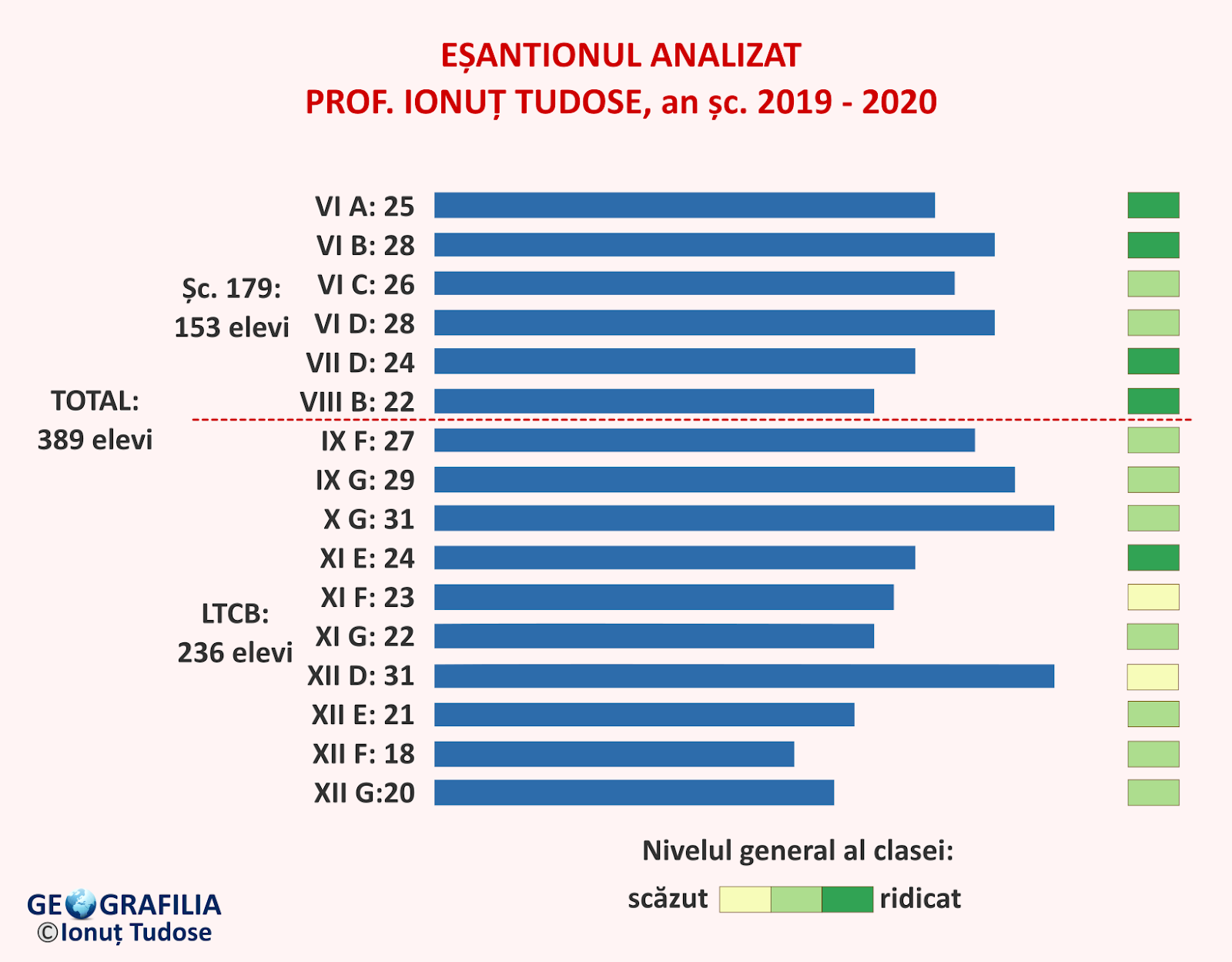 - Inactivitatea/absenteismul s-au dublat la clasele VI, VII, VIII, X, XII. Cele mai spectaculoase creșteri ale inactivității se înregistrează la clasele terminale, din cauza iminentelor examene naționale. Diminuarea interesului pentru geografie la clasele a XII-a și a VIII-a în acest interval de timp este normală și comparabilă cu situația din anii trecuți.